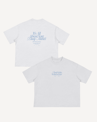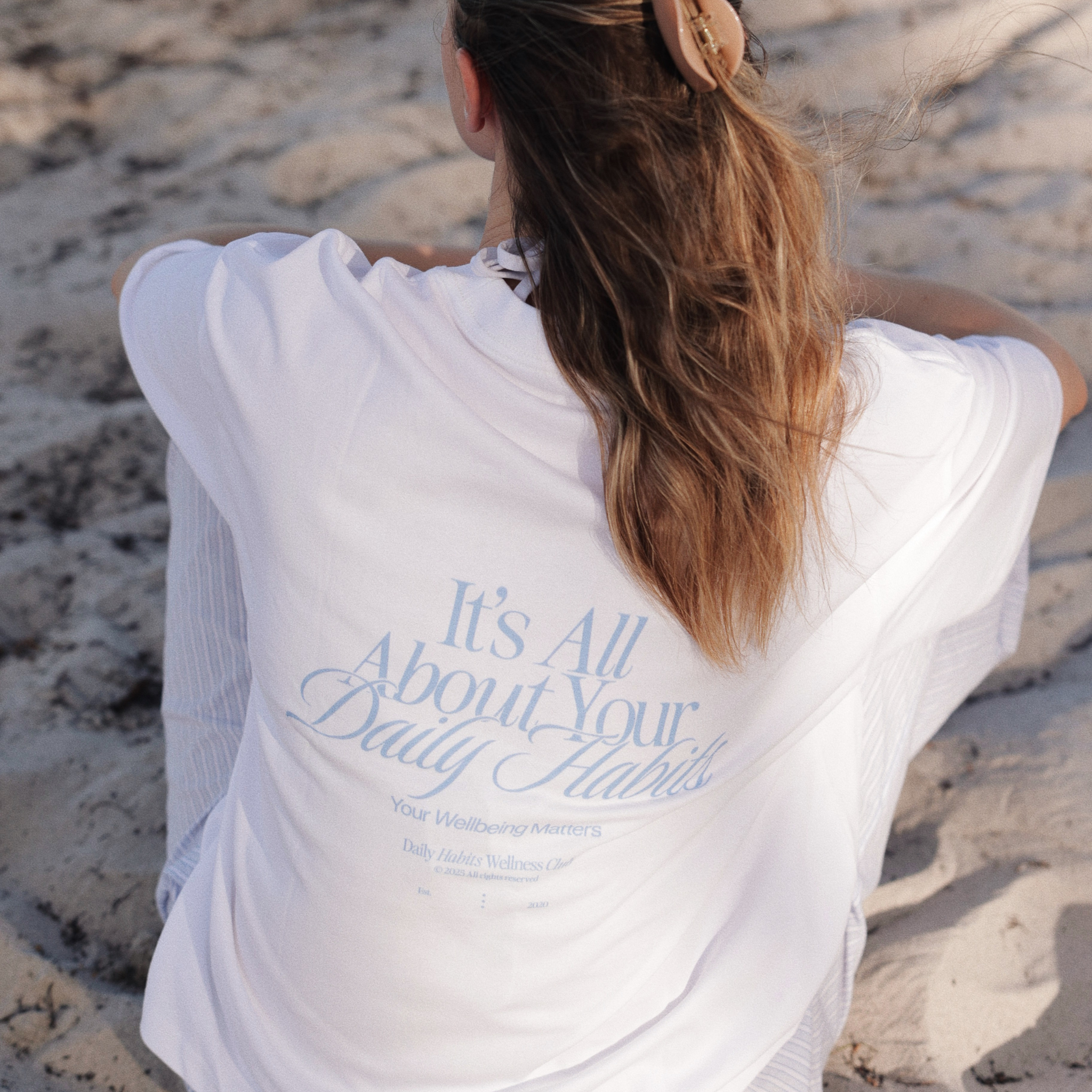 Wrap yourself in ease and intention with our Daily Habits Wellness Club Tee— a soft, lightweight essential designed to feel like your favorite reminder. This unisex tee features our signature mantras:“it’s all about your daily habits” and “your wellbeing matters,” grounding you in purpose with every wear. Made from 100% cotton, it’s breathable, versatile, and meant to move with you through every mindful moment — from morning rituals to slow afternoons.